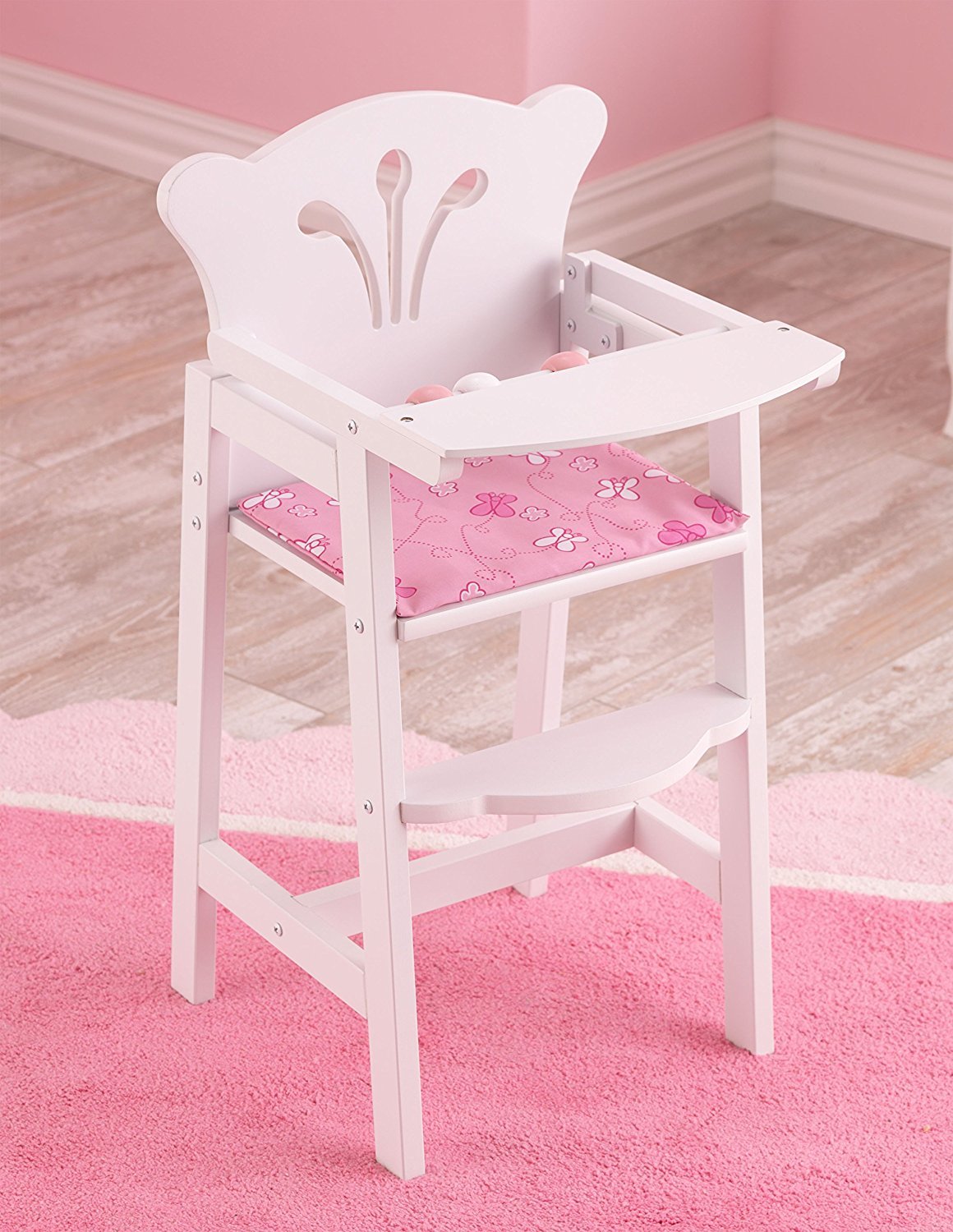 Jídelní židlička pro panenky v bílé barvě s růžovým obustranným polstrováním a odjímatelnou jídelní částí. Krásná židlička s propracovanými detaily skrývá i možnost hry u jídelní části.