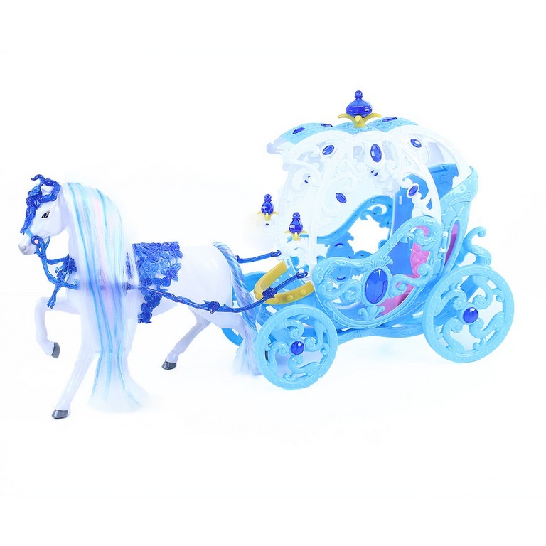 Bílý kůň s dlouhou modro-bílo-růžovou hřívou je zapřažený za krásný pohádkový kočár, ve kterém můžeš vozit své panenky.