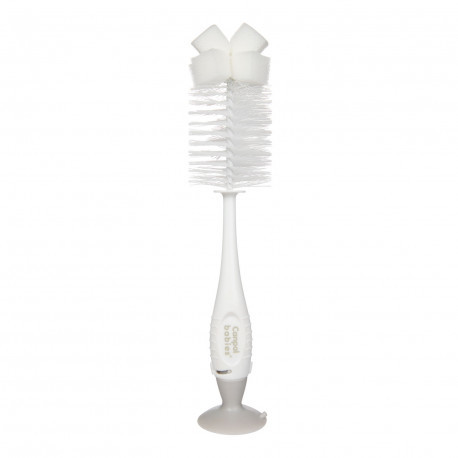 Tento speciálně tvarovaný kartáč disponuje dvojitým kartáčkem: větší hlavní kartáč je vybaven houbičkou, která účinně odstraňuje nečistoty ze dna lahve, aniž by poškrábala povrch. Malý kartáček, schovaný v rukojeti a opatřený vlastní přísavkou, je ideální pro důkladné vyčištění saviček a odstranění zbytků mléka nebo kaše.
