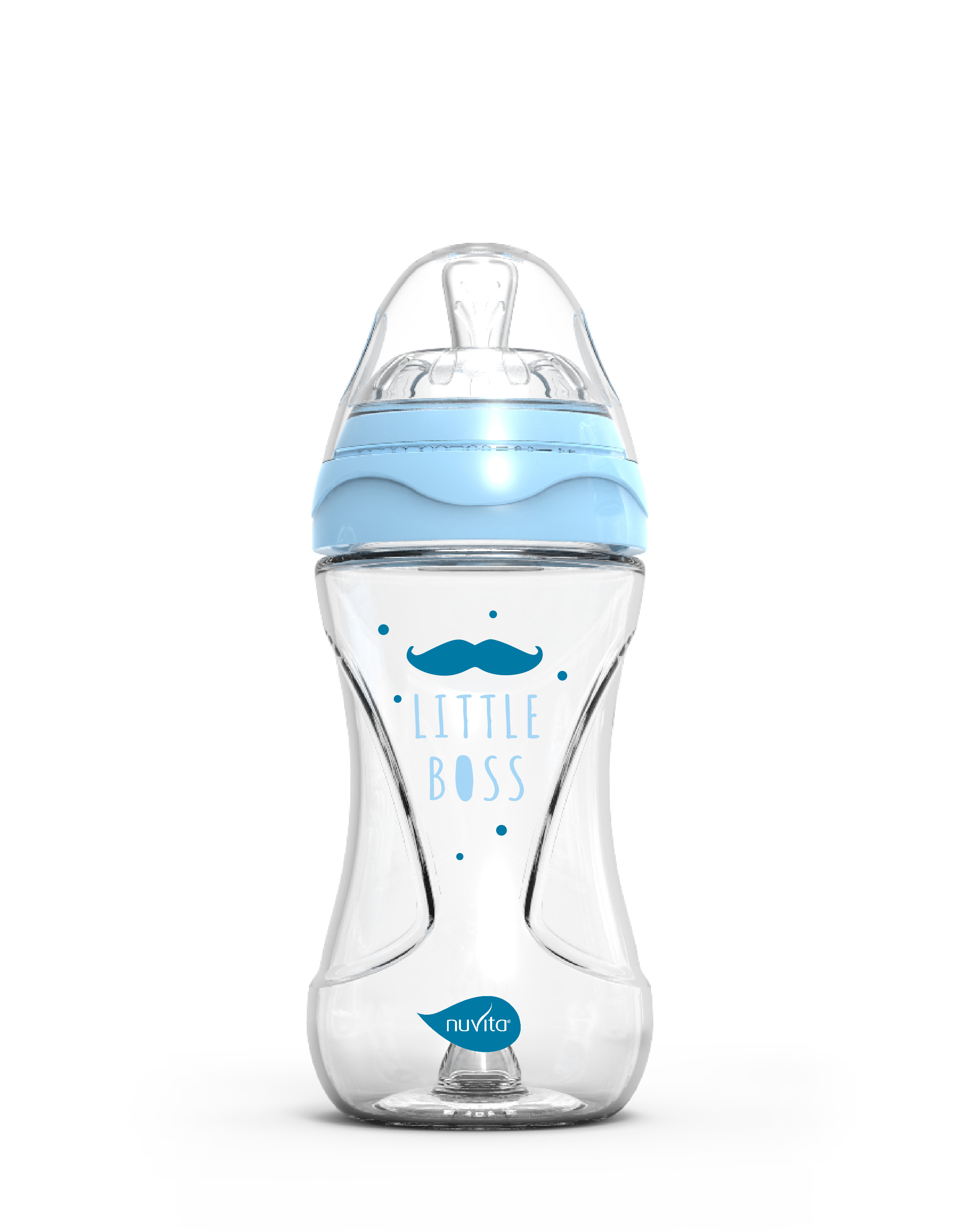 Skleněná lahvička Nuvita s ergonomickým tvarem a objemem 240 ml.