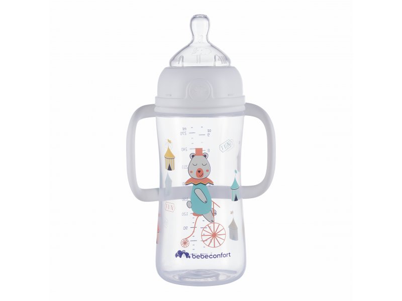 Kojenecká lahvička Bebeconfort Emotion se silikonovou savičkou, která svým tvarem a vlastnostmi připomíná mateřský prs. Dítě tak téměř nepociťuje rozdíl mezi kojením a krmením z lahvičky. Lahvička je antikoliková, opatřená dvojitým ventilačním systémem na okraji savičky, který citlivě zabezpečí únik vzduchu z láhve, tím umožní plynulé sání tekutiny a zároveň snižuje riziko břišní koliky. Odnímatelná držadla a ergonomický tvar lahvičky umožňují snadné držení během krmení. Víčko chrání čistotu savičky během přenášení či uskladnění. Široké hrdlo usnadňuje plnění i čištění. Lahvička je dodávána se savičkou s variabilním průtokem. Pootočením lahvičky můžete zvolit rychlost průtoku mléka od střední po rychlou úroveň. Náhradní savičky se prodávají samostatně. Neobsahuje bisfenol A. Vhodné pro děti od 6 měsíců.
