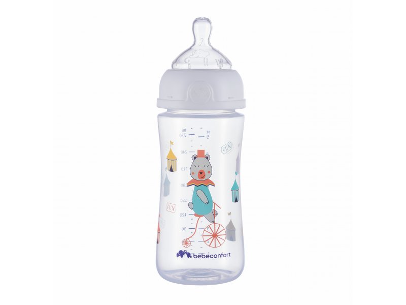 Kojenecká lahvička Bebeconfort Emotion se silikonovou savičkou, která svým tvarem a vlastnostmi připomíná mateřský prs. Dítě tak téměř nepociťuje rozdíl mezi kojením a krmením z lahvičky. Lahvička je antikoliková, opatřená dvojitým ventilačním systémem na okraji savičky, který citlivě zabezpečí únik vzduchu z láhve, tím umožní plynulé sání tekutiny a zároveň snižuje riziko břišní koliky. Ergonomický tvar lahvičky umožňuje snadné držení během krmení. Víčko chrání čistotu savičky během přenášení či uskladnění. Široké hrdlo usnadňuje plnění i čištění. Lahvička je dodávána se savičkou s variabilním průtokem. Pootočením lahvičky můžete zvolit rychlost průtoku mléka od pomalé po střední úroveň. Náhradní savičky se prodávají samostatně. Neobsahuje bisfenol A. Vhodné pro děti od narození.