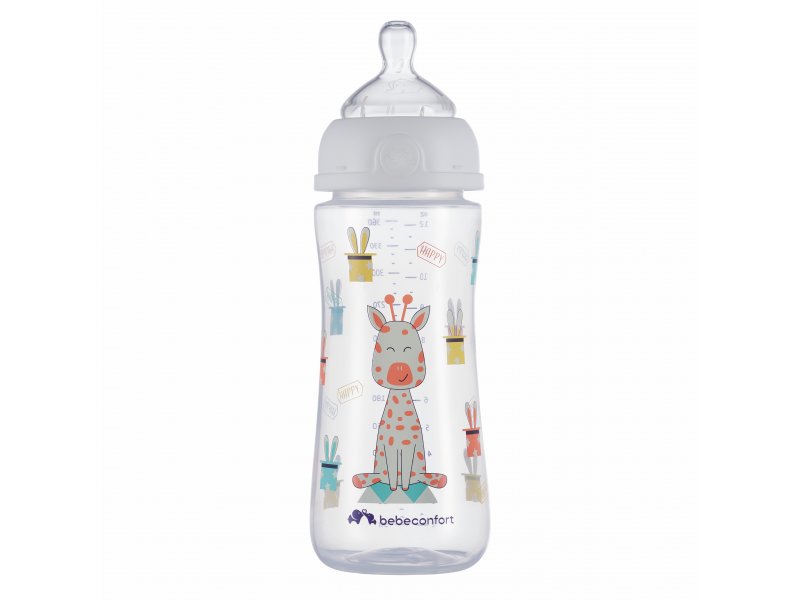 Kojenecká lahvička Bebeconfort Emotion se silikonovou savičkou, která svým tvarem a vlastnostmi připomíná mateřský prs. Dítě tak téměř nepociťuje rozdíl mezi kojením a krmením z lahvičky. Lahvička je antikoliková, opatřená dvojitým ventilačním systémem na okraji savičky, který citlivě zabezpečí únik vzduchu z láhve, tím umožní plynulé sání tekutiny a zároveň snižuje riziko břišní koliky. Ergonomický tvar lahvičky umožňuje snadné držení během krmení. Víčko chrání čistotu savičky během přenášení či uskladnění. Široké hrdlo usnadňuje plnění i čištění. Lahvička je dodávána se savičkou s variabilním průtokem. Pootočením lahvičky můžete zvolit rychlost průtoku mléka od střední po rychlou úroveň. Náhradní savičky se prodávají samostatně. Neobsahuje bisfenol A. Vhodné pro děti od 6 měsíců.