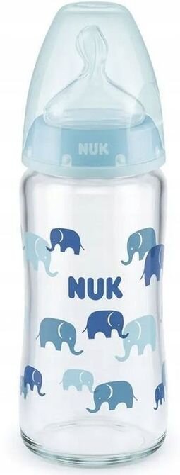 Butelka First Choice+ z wbudowanym wskaźnikiem temperatury zmienia swój kolor w zależności od temperatury zawartości butelki: jeżeli pokarm jest za gorący, wskaźnik, który zwykle jest niebieski zmienia kolor na biały. Wskaźnik temperatury NUK jest przewidziany jako dodatkowa weryfikacja. Prosimy o sprawdzenie temperatury bezpośrednio przed podaniem pokarmu dziecku. Wyjątkowo miękki smoczek dostosowany do kształtu jamy ustnej. Butelka o pojemności 240ml: 6-18 miesięcy M (do mleka modyfikowanego). Posiada antykolkowy system odpowietrzania Air System który zapewnia naturalny wypływ pokarmu. Butelki testowane w szpitalach - dla optymalnego łączenia karmienia piersią i butelką. Butelka posiada prosty, elegancki wzór, wykonana z wysokiej jakości szkła odpornego na wysokie temperatury. Butelka ze smoczkiem silikonowym w rozmiarze M. Wymiary/waga: wymiary produktu (wys. x szer.)[cm]: 19x6, wymiary opakowania (wys. x szer. x gł.)[cm]: 21x7x7, waga produktu bez opakowania [kg]: 0,24 kg, waga produktu w opakowaniu [kg]: 0,27 kg. Produkt przeznaczony dla dzieci w wieku: 0-6m+. Pakowany w kartonik z okienkiem. Wyprodukowano w Niemczech.