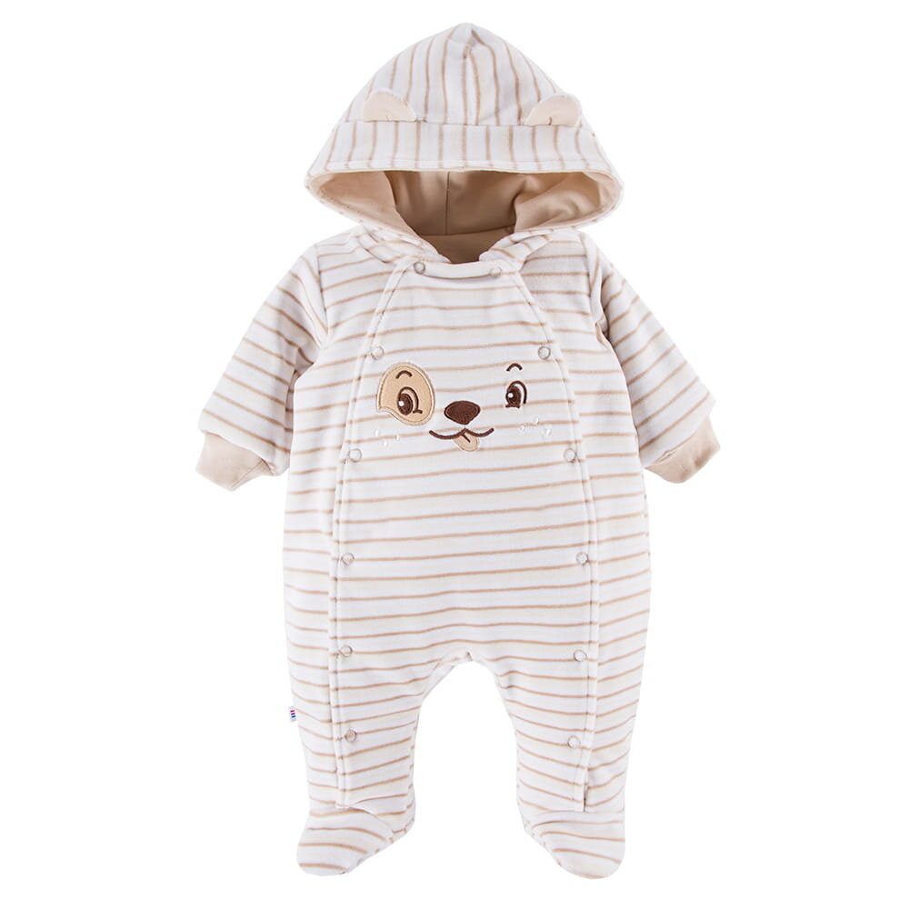 Kombinezon dziecięcy beżowy wykonany z ciepłego weluru. Kombinezon dziecięcy posiada kaptur i urocze uszka. Podszewka w kombinezonie wykonana jest w 100% z bawełny. Pajacyk z kapturem będzie idelany na wyjście ze szpitala w chłodne miesiące. W wyprawce dla dzieci rodzących się zimą i jesienią to obowiązkowy element.