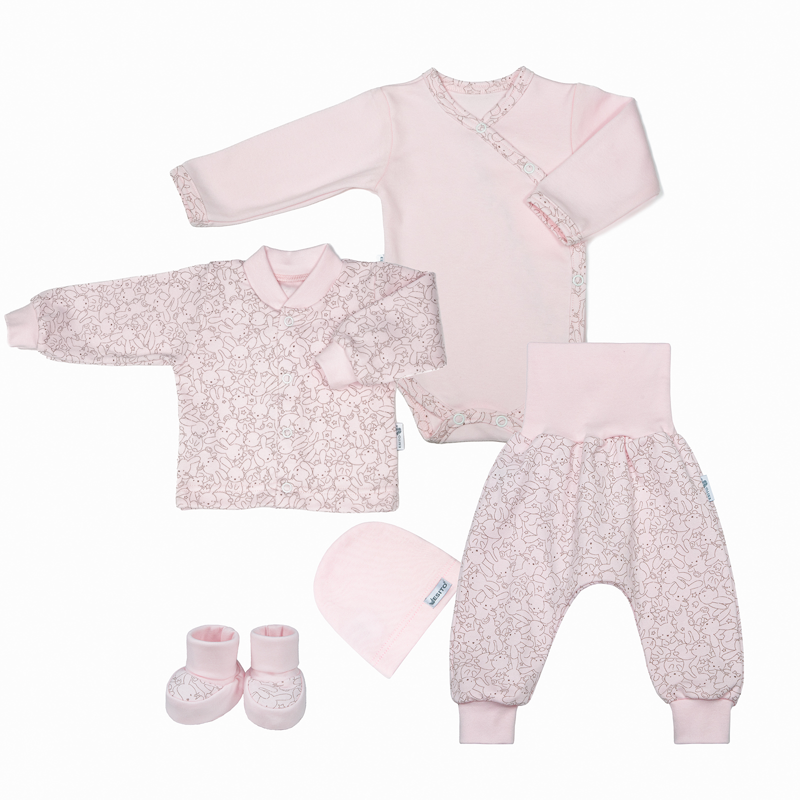 - Pětidílná kojenecká souprava do porodnice v něžné růžové barvě.