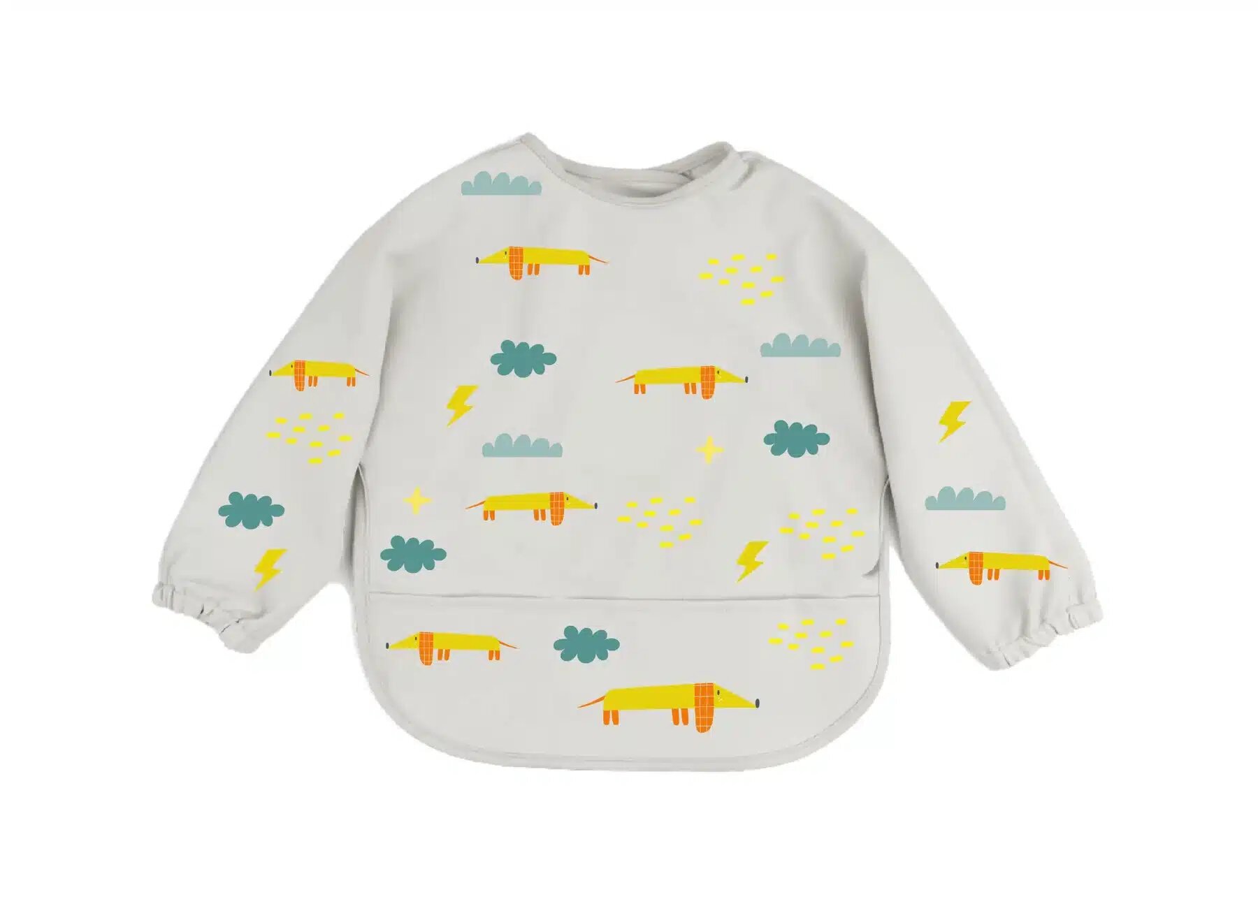 Podbradník je vyrobený z nepremokavej tkaniny, ktorá sa ľahko čistí, odoláva väčšine škvŕn a pachov. 100% recyklovaný Oeko-Tex polyester je nielen vodeodolný, ale je tiež možné ho umývať v práčke. Vodoodpudivý materiál robí tento všestranný podbradník nielen ideálnym na jedenie a kŕmenie, ale je tiež skvelý pre umelecké a remeselné projekty doma alebo v škôlke. Vstavané vrecko na zachytávanie pomáha udržať neporiadok pri jedle na minimum.