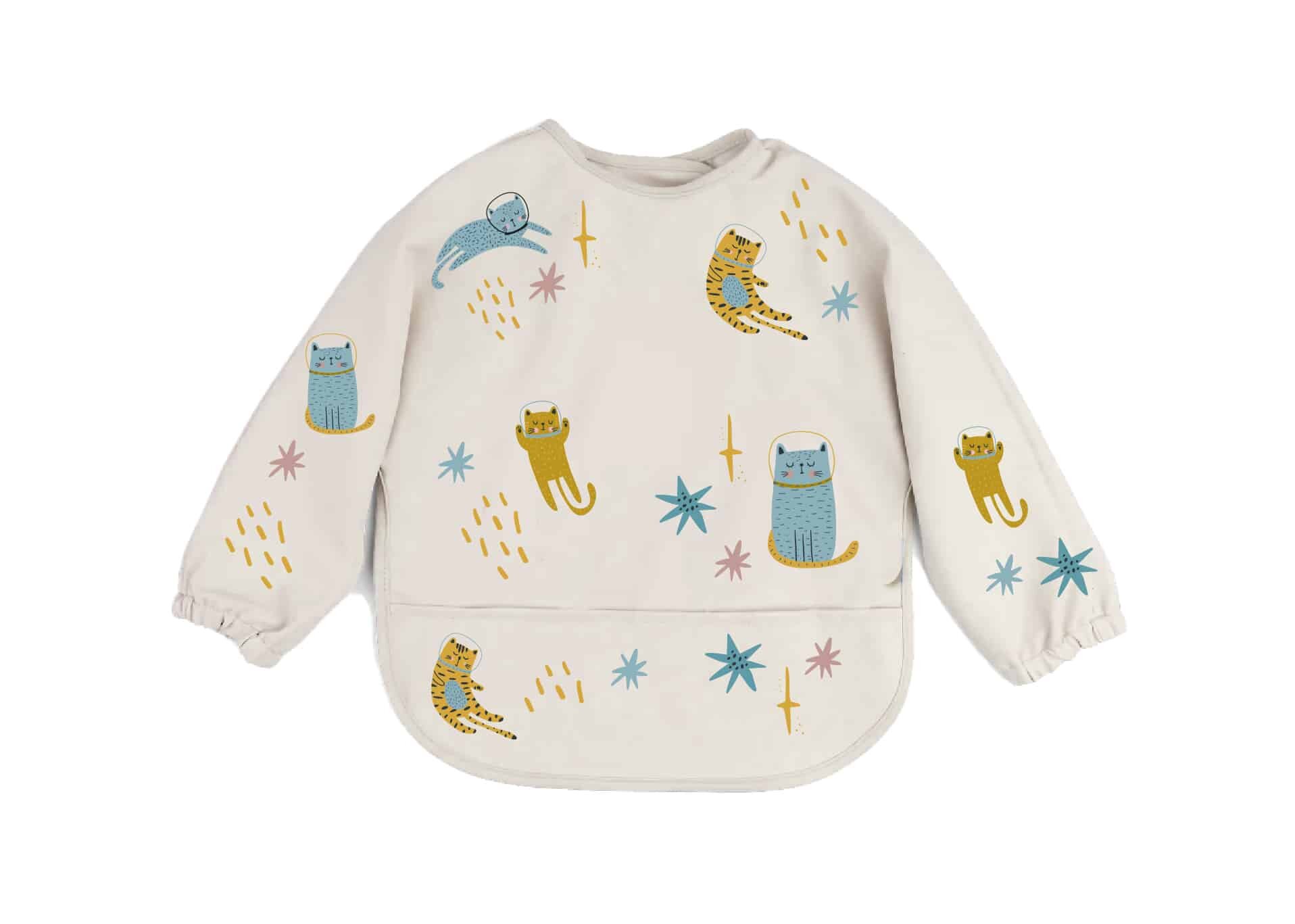 Podbradník je vyrobený z nepremokavej tkaniny, ktorá sa ľahko čistí, odoláva väčšine škvŕn a pachov. 100% recyklovaný Oeko-Tex polyester je nielen vodeodolný, ale je tiež možné ho umývať v práčke. Vodoodpudivý materiál robí tento všestranný podbradník nielen ideálnym na jedenie a kŕmenie, ale je tiež skvelý pre umelecké a remeselné projekty doma alebo v škôlke. Vstavané vrecko na zachytávanie pomáha udržať neporiadok pri jedle na minimum.