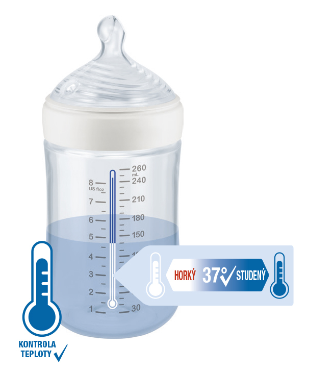 Jedinečná kojenecká láhev NUK s kontrolou teploty. Kontrola teploty pomáhá rodičům dosáhnout optimální teploty a zajistit tak bezpečné krmení jejich dítěte. Teplota obsahu láhve změní její barvu pokud je pokrm příliš horký, modrá kontrolka se změní na bílou. Kontrolka vypadá jako teploměr, je umístěna mezi ryskami a teplota obsahu láhve změní její barvu. Vhodná pro děti od 6 měsíců, velikosti M.