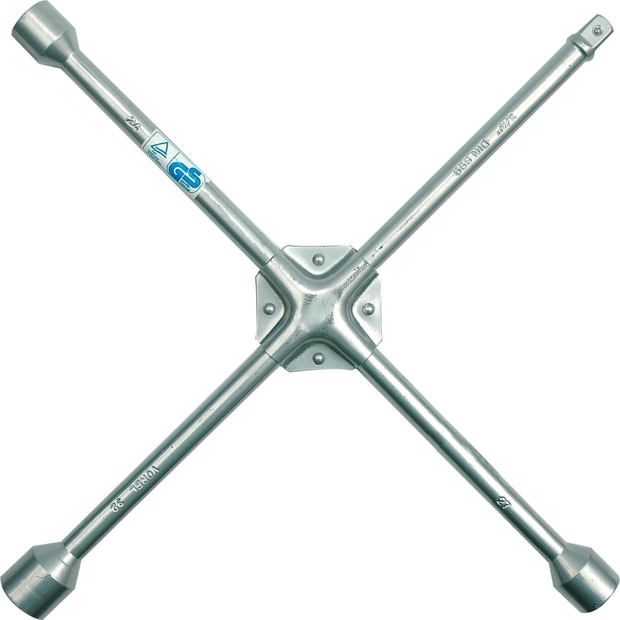 Celokovový klíč ve tvaru kříže, který je určen pro povolování či utahování matic kol automobilů.