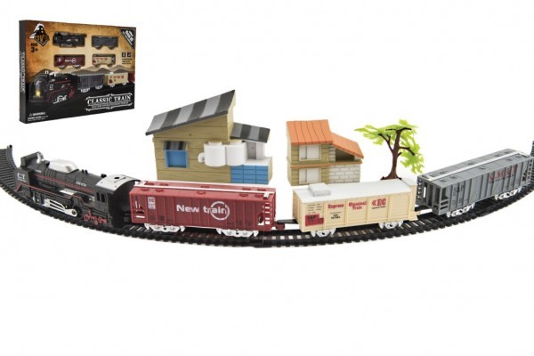 Vlak + 3 vagóny s kolejemi s doplňky plast 104x68cm na baterie se světlem v krabici 46x32x5cm