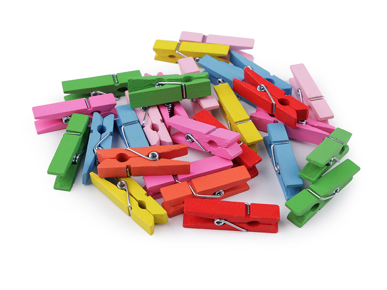 Veselé barevné dřevěné kolíčky využijete na různé dekorace, k aranžování, k balení dárků či k uchycení fotografií na provázek.