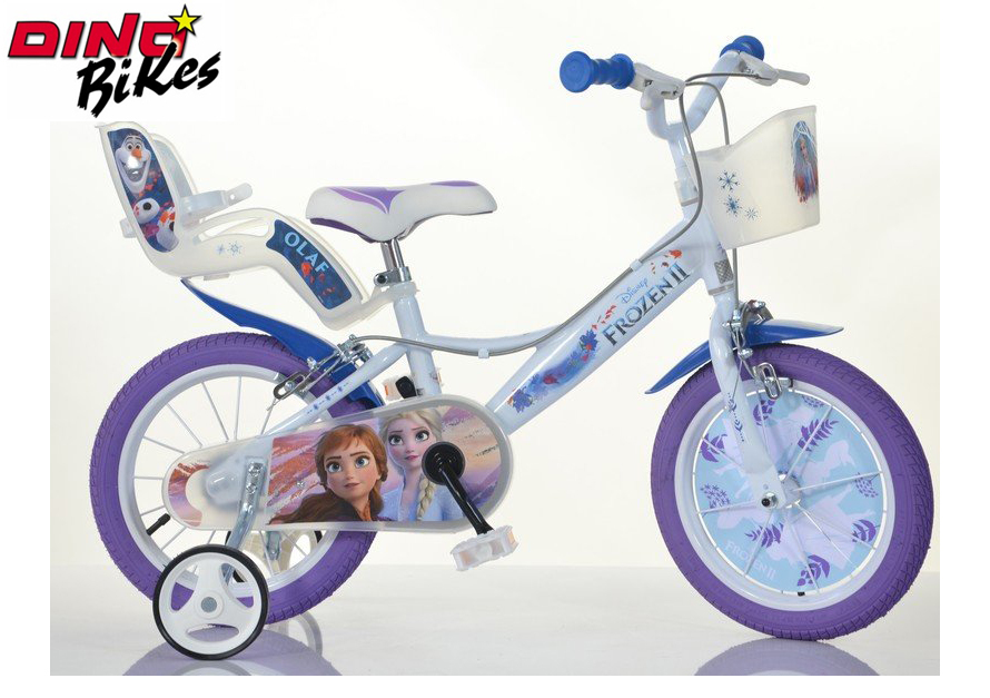 Dětské kolo - 14 "Dino 144RF3 se sedačkou pro panenku a košíkem a licencí Frozen 2, výrobce Dino Bikes Italy je kolo pro malé cyklistky s licencí Frozen. Kola mají kovový ráfek se vzduchem plněnou pneumatikou. Kolo má dvě V-brake brzdy. Středové složení má volnoběh. Bicyklík je vybaven pomocnými kolečky, košíkem a sedačkou pro panenku. Hmotnost bicyklíka je 8,9 kg.