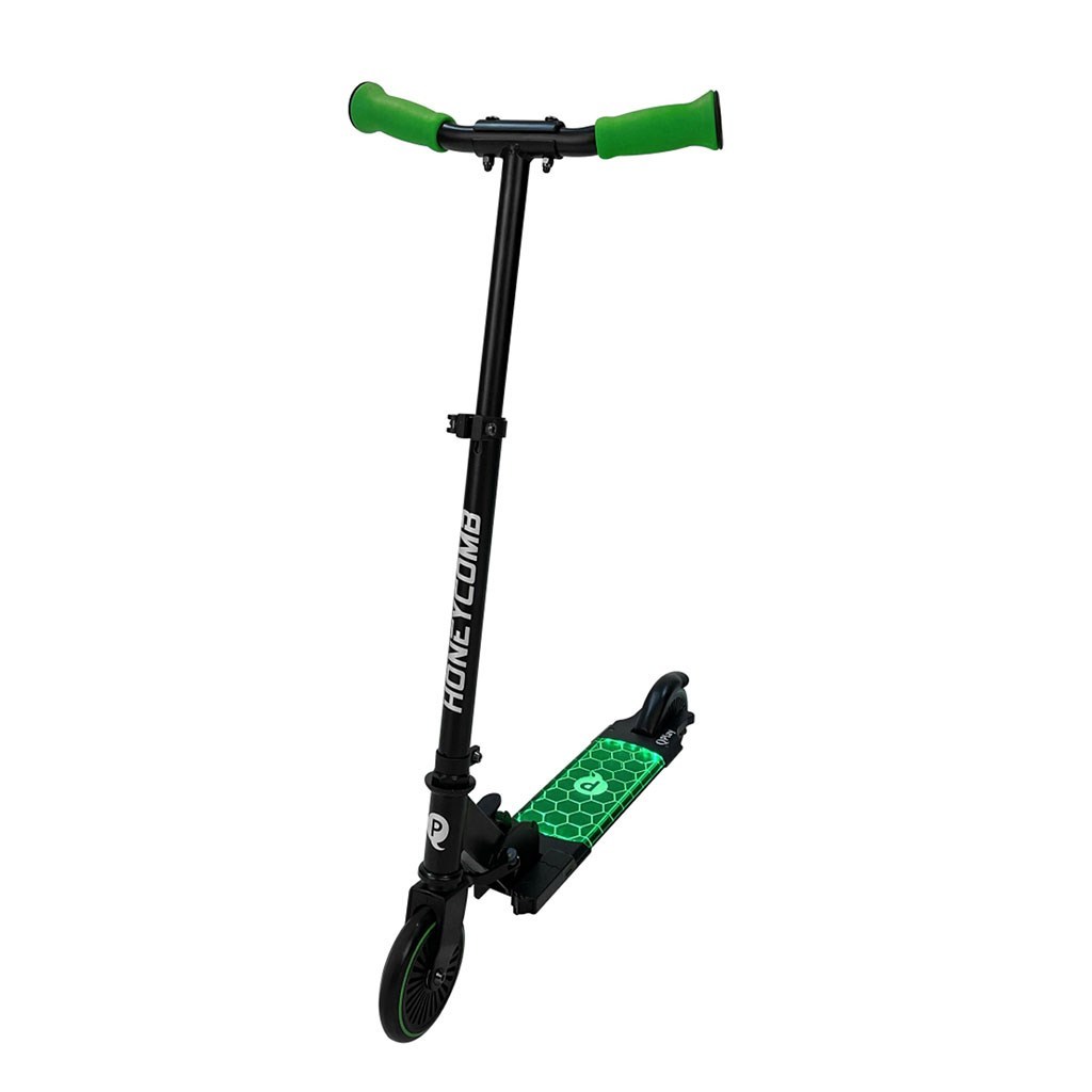 Koloběžka Qplay Honeycomb je specifická svou světelnou plošinou, která má strukturu plástve medu. Dítě si může vybrat ze tří možností LED osvetlení plošiny - záře, blesk a rychlý blesk. Matná černá deska byla navržena tak, aby světla na koloběžce ještě více vynikla. Řídítka jsou výškově nastavitelná. Pro zastavení koloběžky je koloběžka vybavena nožní brzdou. Koloběžka QPlay Honeycomb má inovativní systém rychlého skládání, který se skvěle hodí jak doma, tak na cestách - nezabere mnoho místa. Lehká a pevná konstrukce zaručuje bezpečnost a pohodlí při používání. Nespornou výhodou jsou nastavitelná řídítka, takže koloběžka může růst s vaším dítětem. Procvičuje motoriku, sílu a svaly nohou a koordinaci pohybů celého těla.