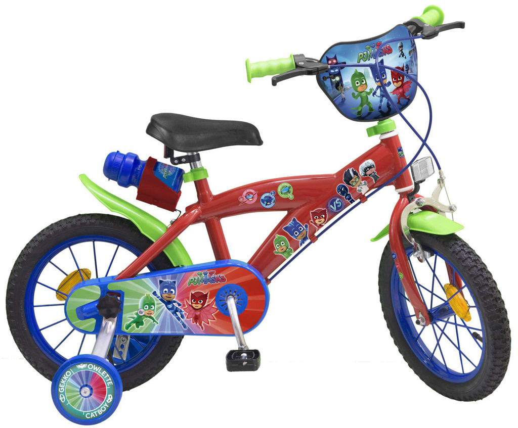 Dětské šlapací kolo Toimsa PJ Mask červeno/modré 14". Vybavení kola - lakovaný rám, přední a zadní brzda, odrazka, nastavitelná řídítka a sedlo, přední a zadní blatník, odrazky, přední závodní číslo a vzadu držák na láhev s lahví, odnímatelná stabilizační kolečka, nafukovací kola a kryt řetězu. Vhodné pro děti od čtyř do šesti let.