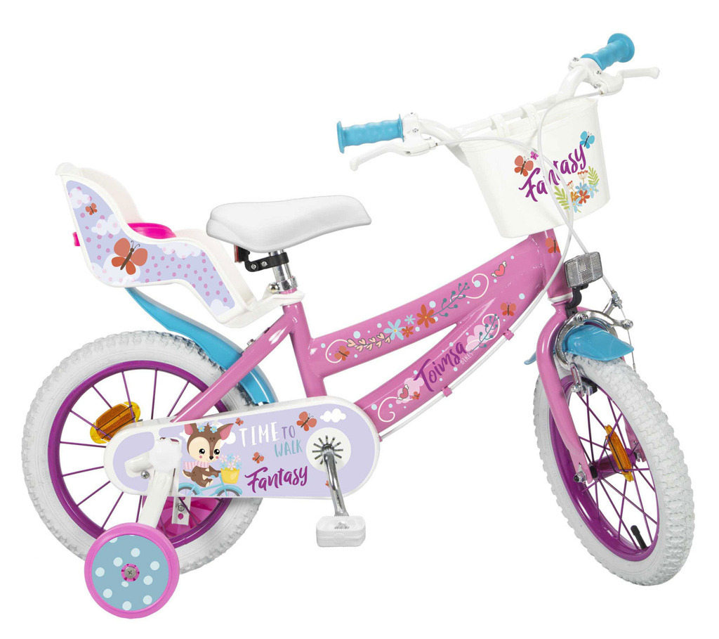 Dětské šlapací kolo Toimsa Fantasy Walk růžovo/modré 14". Vybavení kola - lakovaný rám, přední a zadní brzda, odrazka, nastavitelná řídítka a sedlo, přední a zadní blatník, odrazky, přední košíček a zadní sedačka pro panenky, odnímatelná stabilizační kolečka, nafukovací kola a kryt řetězu. Vhodné pro děti od čtyř do šesti let.