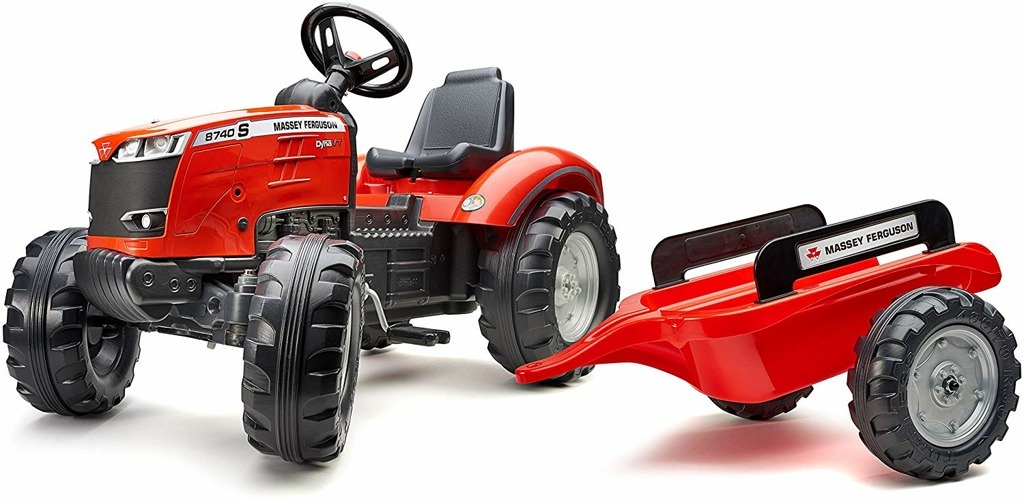Traktor šlapací Massey Ferguson červený s přívěsem a otočným sedadlem. Volant s klaksonem.Velikost 162×54×66 cm. Z vysoce odolného a kvalitního plastu. Věk 3-7 let. Všechny traktory Falk jsou testovány na 50kg - dle požadavků evropských norem. Vyrobeno ve Francii.