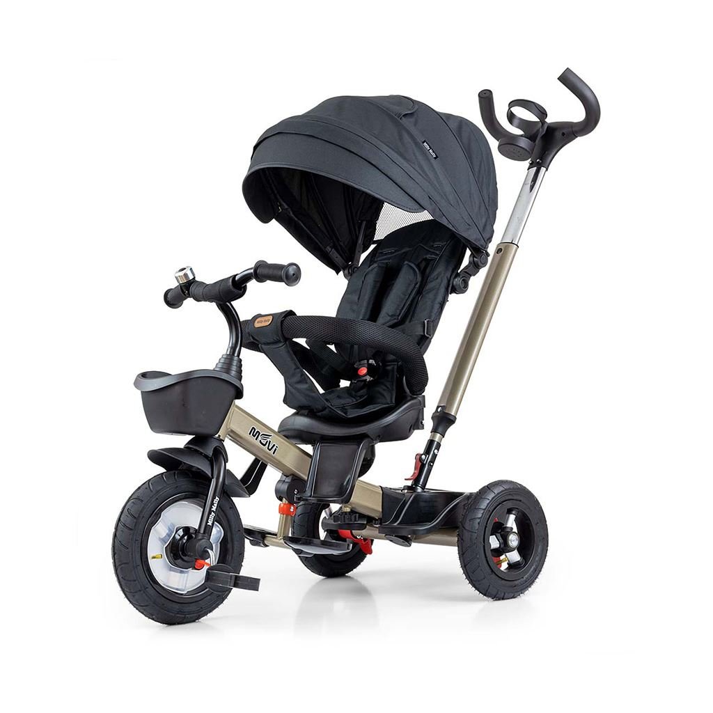 Je vyrobena z kvalitních a odolných materiálů. Má moderní konstrukci, pohodlné a ergonomicky tvarované sedadlo, které je otočné o 360 stupňů, což umožní dítěti cestovat ve směru nebo proti směru jízdy. O pohodlí a bezpečí během jízdy se stará bariérka, tříbodové bezpečnostní pásy, pohodlné stupačky nebo velká nafukovací kola, které skvěle absorbují rázy a poskytují dobrou přilnavost. Tříkolku může ovládat jak dítě, tak i rodič pomocí nastavitelné rukojeti pro tlačení. Po odebrání vodící tyče, sklápěcí stříšky, která chrání před sluncem nebo ostatních komponent bude sloužit jako tříkolka. Tříkolku lze používat rovněž jako alternativu golfového kočárku. Pro uložení hraček nebo potřeb pro dítě je zde praktický úložný košík.