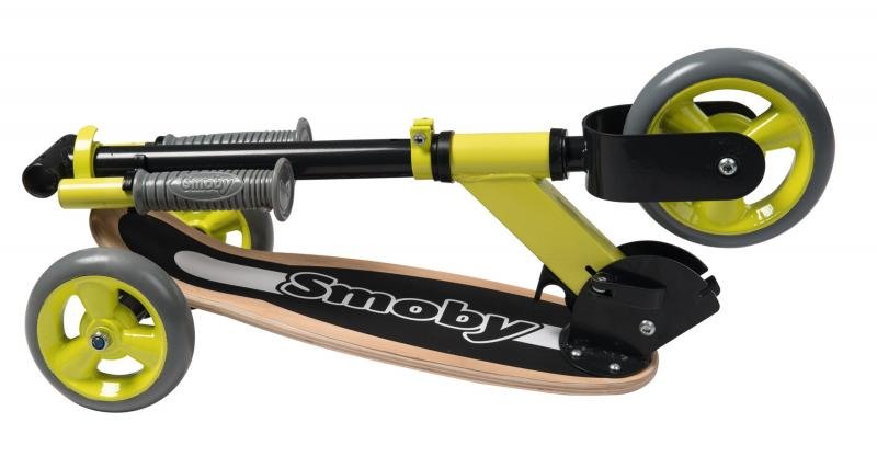 Koloběžka s dřevěným, protiskluzovým stupátkem, kovový rám s výškově nastavitelnými řídítky (67 a 70 cm) a 3 kolečka pro lepší stabilitu. Kolečka s protihlukovou úpravou. Koloběžku lze snadno složit. Max. nosnost 20 kg. Rozměry: 62 x 32 x 70 cm.