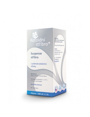 Koloidní stříbro je čisté metalické stříbro (Ag + ), suspenzované (rozložené a rozptýlené) v čištěné vodě (H 2 O) Aqua Purificata. Velikost částic je v řádu nanometrů. Je dodáváno v těchto variantách koncentrací: 5, 10, 15, 20, 30 a 40 ppm.