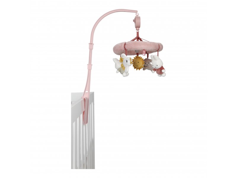 Kolotoč s natahovacím hudebním boxem hraje melodii pro klidné usínání. Pozornost dítěte upoutají otáčející se plyšové hračky v podobě králíčka Miffy, sluníčka a autíček v pastelových barvách. Kolotoč snadno připevníte na bočnici postýlky.