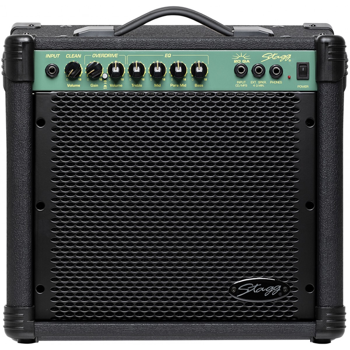 Kombo pro elektrickou kytaru, výkon 20 W RMS, 1x reproduktor 8“, kovová přední mřížka, nástrojový vstup jack 6,3 mm, 3-pásmový ekvalizér (basy/středy/výšky), oddělené parametrické korekce středových frekvencí, ovládání Gain a Volume, funkce Clean s ovládáním hlasitosti, přepínatelný efekt Overdrive s ovládáním úrovně a hlasitosti, vstup stereo jack 6,3 mm pro CD/MP3 přehrávač, sluchátkový výstup jack 6,3 mm, výstup jack 6,3 mm pro externí reproduktor (min. impedance 4Ohm), rozměry (v x š x h) 37,5 x 41,5 x 21 cm, hmotnost 8,9 kg. Barva černá.