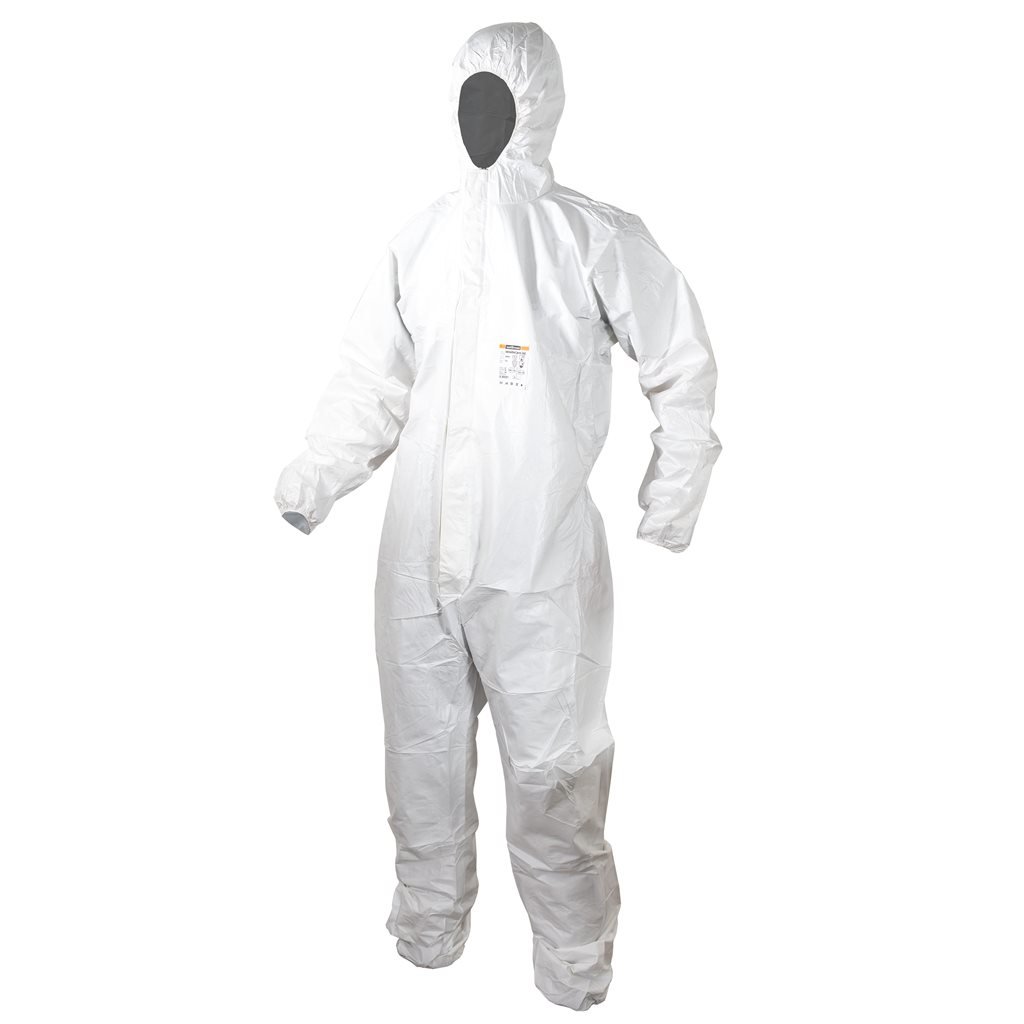 Antistatická voděodolná kombinéza s kapucí, odolná roztokům chemikálií, azbestu a prachu, patří do kategorie CE III, typu 5/6.