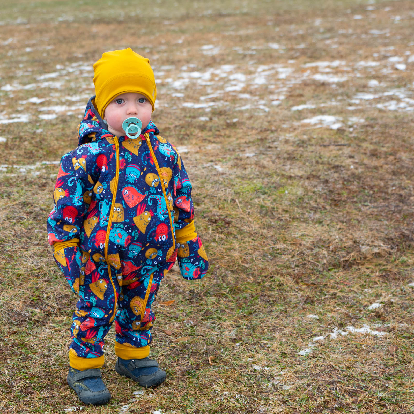 - Volný střih overalu pro volný pohyb při objevování světa. Materiál je jedinečně měkký a pružný nejen okolo zápěstí a nožiček.