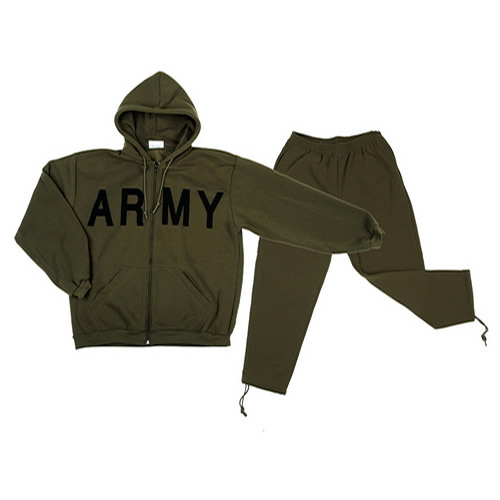 Pohodlná tepláková souprava klasického střihu pro volný čas nebo sport.Tepláky a bunda s kapucí.Na hrudi nápis ARMY. Dvě kapsy pro ruce. Šněrování v kapuci. Náplety na manžetách.Guma v pase a na konci nohavic.