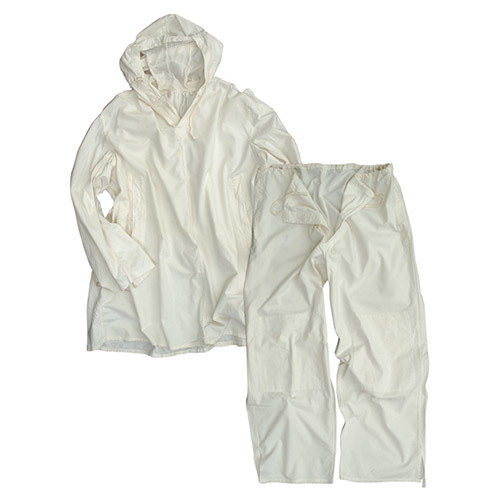 Převlek do sněhu, používaný českou armádou. Bunda s kapucí a kalhoty stahovatelné v pase tkanicí. Materiál 100% bavlna.