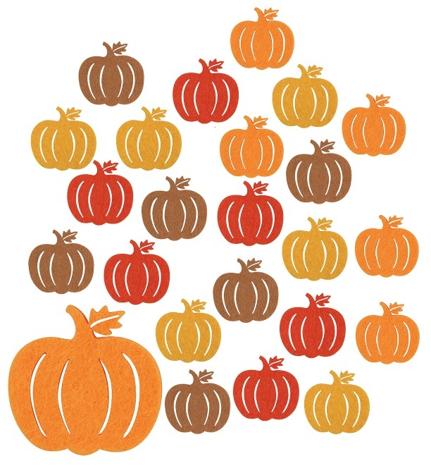 Okouzlete své projekty jedinečnými dekoracemi! Sadu 24 malých filcových dýní s lepicí vrstvou snadno přidáte na jakýkoliv hladký povrch, a díky tomu vaše přáníčka, alba či pozvánky získají neopakovatelný podzimní nádech.