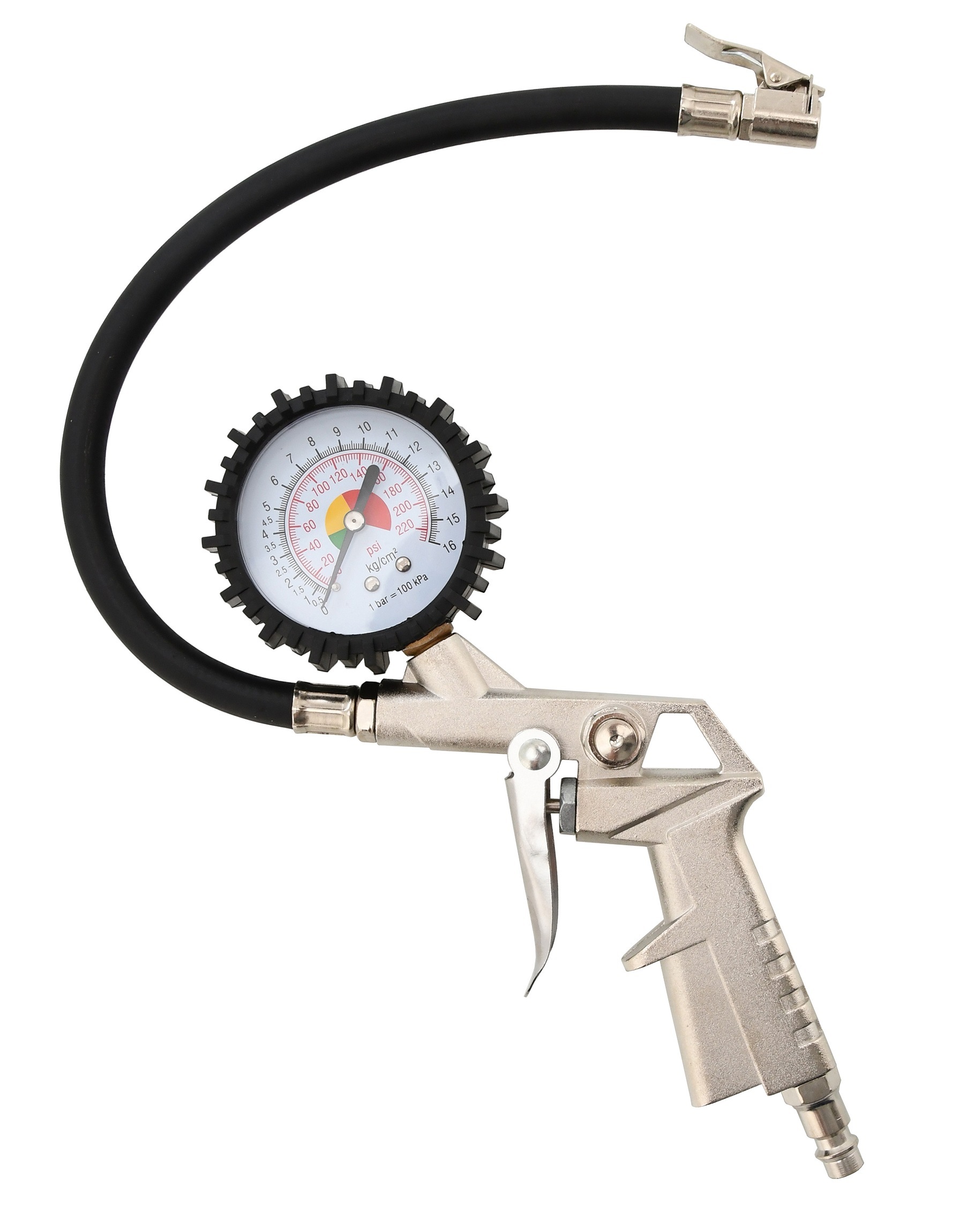Kovová pistole je opatřena hadicí z odolné gumy průměru 12 mm, s délkou 35 cm i s adaptérem, který je určen k nasazení na běžné autoventilky. Zakončení s běžným rozměrem 1/4".