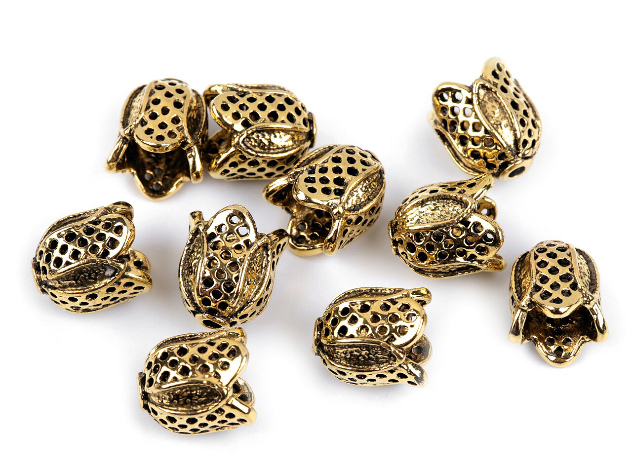 Kovový kaplík ve tvaru květu můžete využít jako zajímavý a oživující prvek v široké škále výrobků. Je vhodný jako koncovka na oděvní šňůrky. Má skvělé využití jako sukýnka na výrobu malých bižuterních andělů.Průvlek horní 2 mm, spodní 7,5 mm, výška 12 mm. číst celé