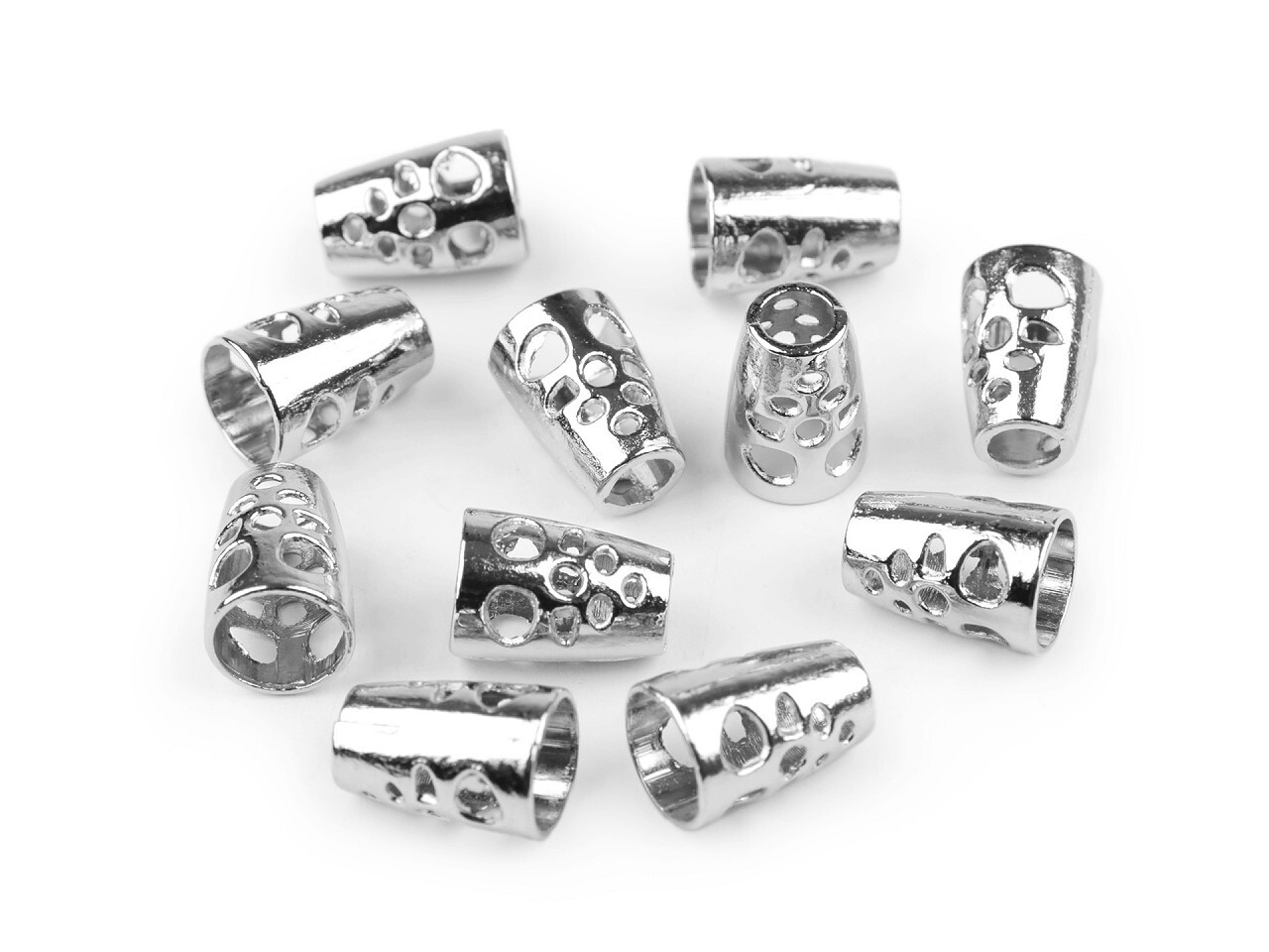 Kovová koncovka s dírkovým ornamentem ozdobí šňůrky na mikině, bundě, kabátku i plavkách. Je vhodná také na kabelky a boty. Šňůrku provléknete koncovkou a zakončíte uzlíkem.Koncovka je vhodná pro šňůrky s průměrem do 5 mm.