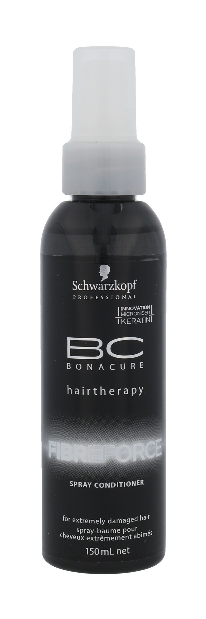 **Schwarzkopf BC Bonacure Fibreforce Spray Conditioner** kondicioner ve spreji pro silně poškozené vlasy. Bezoplachová péče, která ošetřuje poškozené vlasy. Obsahuje keratiny, které jsou identické s keratiny, které se přirozeně nacházejí uvnitř vlasového vlákna. Keratiny pronikají hluboko do struktury vlasů a znovu vlasy vystavují a vytvářejí membrány. **Použití:** Nastříkejte na umyté a ručníkem prosušené vlasy. Pročešte hřebenem, aby se přípravek dobře rozprostřel. Neoplachujte.