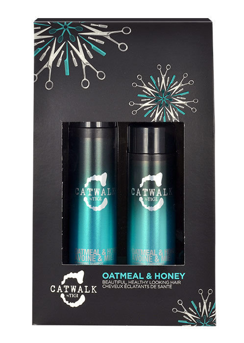 **Tigi Catwalk Oatmeal & Honey** kazeta šampon a kondicionér pro poškozené vlasy. **Složení kazety**: **Oatmeal & Honey Nourishing Shampoo 300ml - Šampon pro poškozené vlasy** Hydratuje vlasy. Zachovává barvu vlasů. Vlasy jsou hebké a vyživené. Zabraňuje krepatění vlasů. **Použití**: Aplikujte na mokré vlasy, napěňte a poté důkladně opláchněte. **Oatmeal & Honey Nourishing Conditioner 250 - Kondicionér pro poškozené vlasy** Zachovává barvu vlasů. Poškozeným vlasům navrací lesk a sílu. **Použití**: Aplikujte na umyté vlasy, nechte chvíli působit a opláchněte.