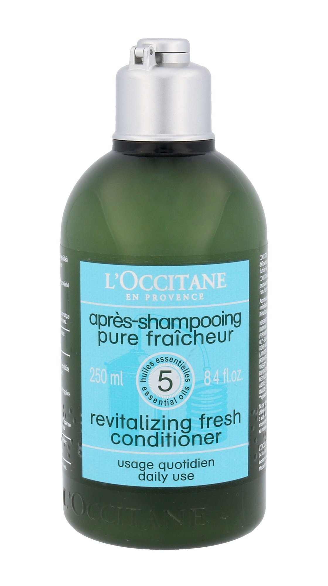 Kondicionér **L´Occitane Revitalizing Fresh Conditioner**. Kondicionér L´Occitane Revitalizing Fresh Conditioner dodává vlasům svěží pocit. Složení obohacené o 5 esenciálních olejů vlasy hloubkově vyživuje a hydratuje. Dokonale vlasy čistí a odstraňuje veškeré nečistoty. Vhodné pro všechny typy vlasů. **Použit**: Aplikujte na umyté vlasy. Nechte chvíli působit a poté důkladně opláchněte.