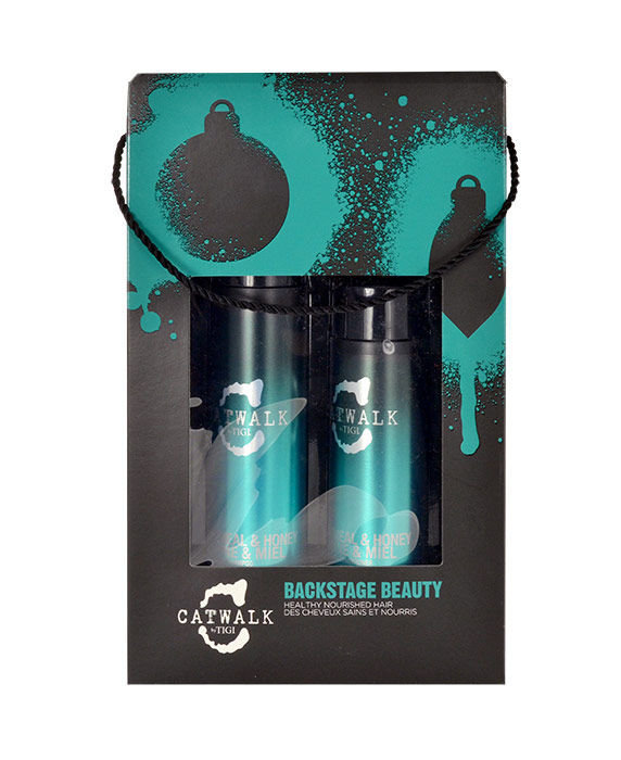 Kazeta pro poškozené vlasy **Tigi Catwalk Backstage Beauty Kit**. **Složení kazety**: **Oatmeal & Honey Nourishing Shampoo 300ml - Šampon pro poškozené vlasy** Hydratuje vlasy. Zachovává barvu vlasů. Vlasy jsou hebké a vyživené. Zabraňuje krepatění vlasů. **Použití**: Aplikujte na mokré vlasy, napěňte a poté důkladně opláchněte. **Oatmeal & Honey Nourishing Conditioner 250ml - Kondicionér pro poškozené vlasy** Zachovává barvu vlasů. Poškozeným vlasům navrací lesk a sílu. **Použití**: Aplikujte na umyté vlasy, nechte chvíli působit a opláchněte.