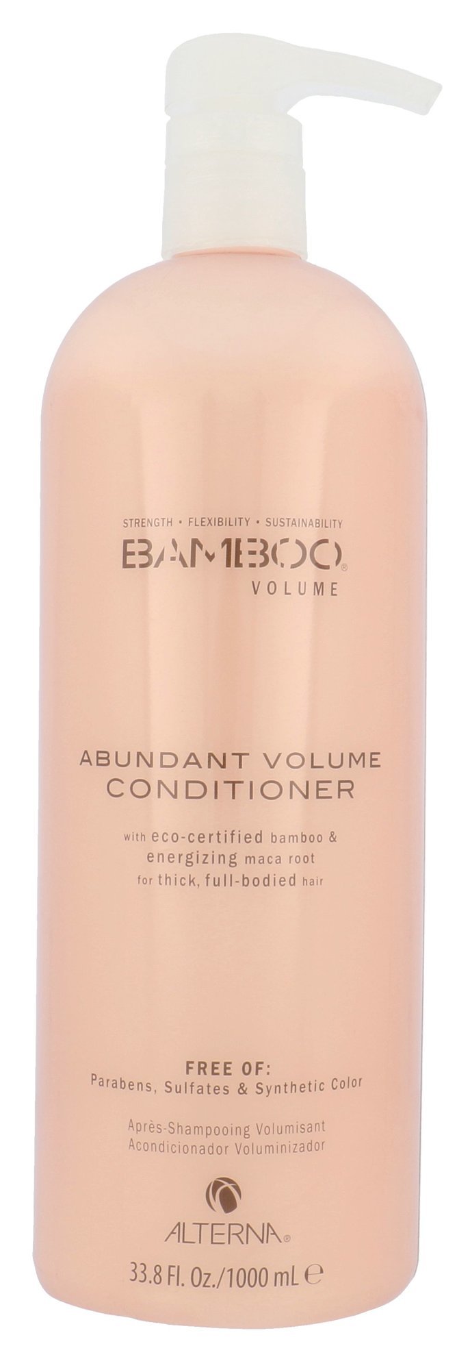 Kondicionér **Alterna Bamboo Abundant Volume**. Kondicionér Alterna Bamboo Abundant Volume pro hloubkovou hydrataci a intenzivní péči. Složení obohacené o komplex Colour Hold, který chrání barvu vlasů a zabraňuje jejímu vymývání. Vlasům dodává přirozený lesk, pružnost a zdravý vzhled. Díky obsaženému extraktu z bambusu a kořenu Maca budou vlasy vyživené a obnovené. Zanechává vlasy plné objemu. **Složení**: _colour hold komplex_ - chrání barvu vlasů _extrakt z bambusu -_ hloubkově vlasy hydratuje _kořen Maca_ - posiluje vlasy **Použití**: Aplikujte do umytých vlasů. Nechte chvíli působit a poté důkladně opláchněte.