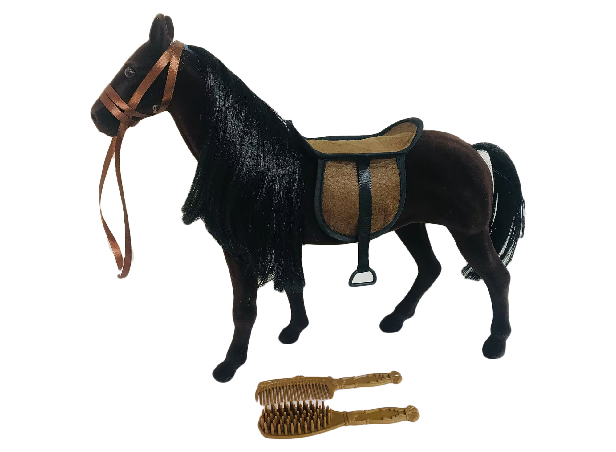 Kůň tmavý. Velikost 35cm. Obalení obsahuje koně se sedlem a dva hřebeny. číst celé
