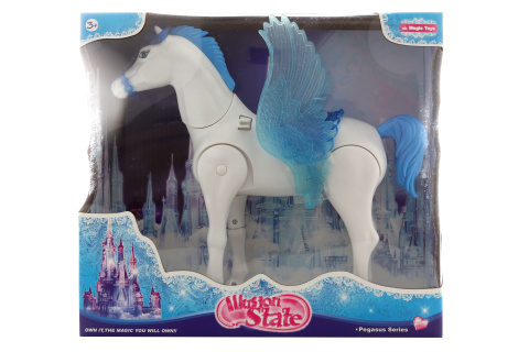 Plastový koník s hýbajícími křídly. Po vložení baterií koník chodí, hýbe křídly a hraje. Napájení na 4 AA baterie (nejsou součástí balení). Rozměry balení cca 32,5 x 29 x 9,5 cm. Věk 3+