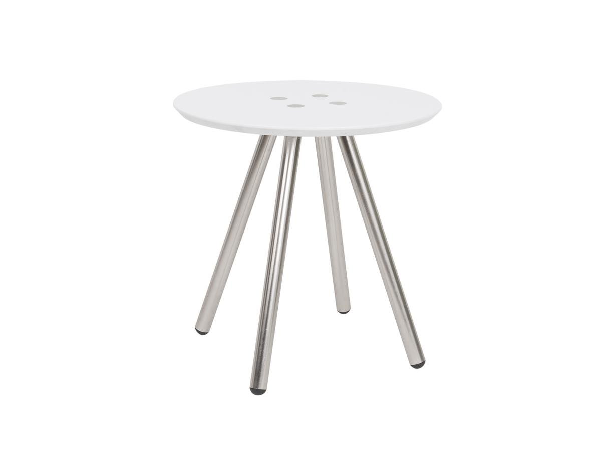 Malý stolek v bílé barvě se stříbrnými nohami.