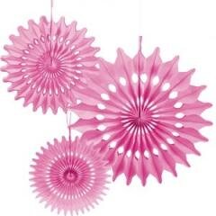 Papierowe rozety dekoracyjne, 3 sztuki w opakowaniu. Rozmiary: 1 x 14 cm, 1 x 20 cm, 1 x 30 cm. Kolor różowy. Produkt wykonany z materiałów pozyskanych legalnie i odpowiedzialnie.