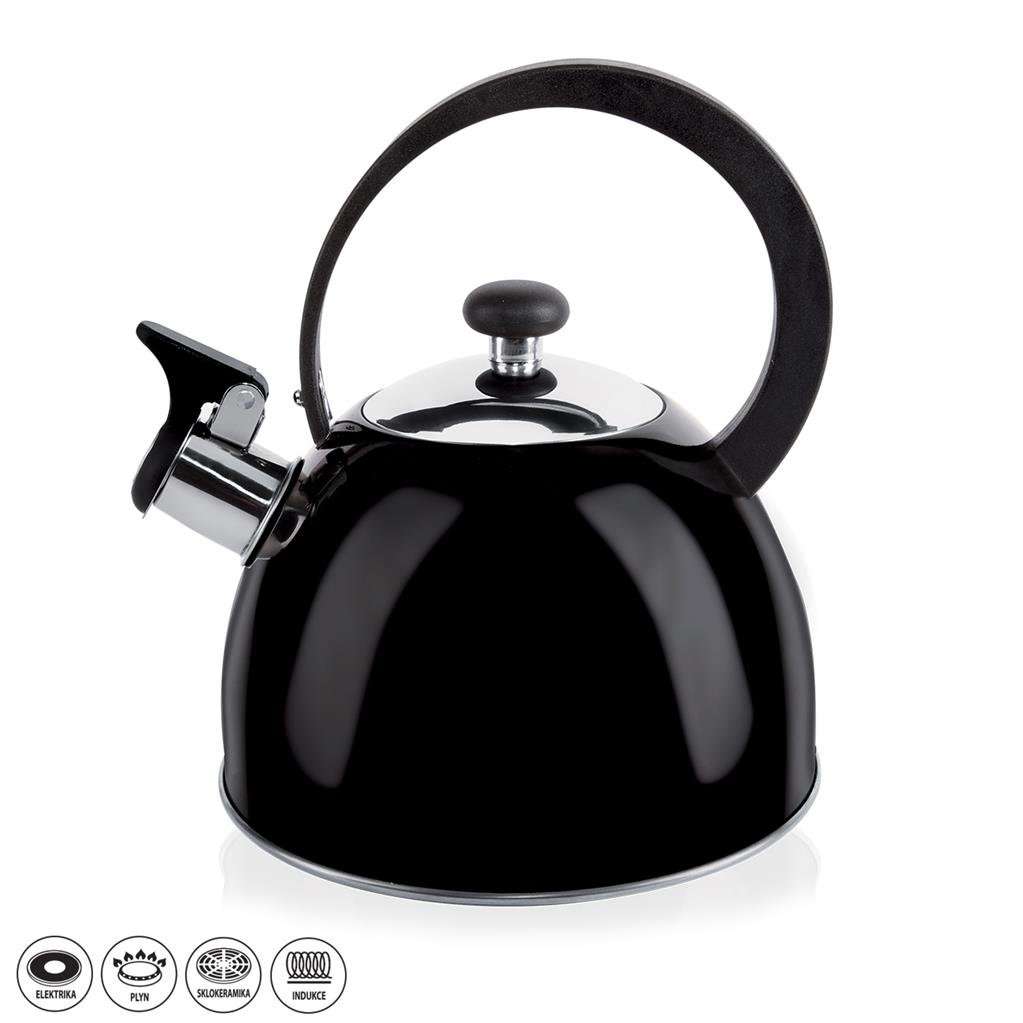 Luxusní čajník s píšťalkou je vyroben z kvalitního nerezu a nylonu v moderním designu. Skvěle se uplatní jak v klasické, tak moderní kuchyni. Barva černá. Rozměry: celkový objem 1,8 l, užitný objem 1,5 l, pr. 18,5 cm, v. 21 cm. Vhodný na všechny typy spotřebičů. Čajník je nutné plnit minimálně do poloviny, aby nedocházelo k jeho přehřívání. Barevné změny na vnějším povrchu při nedodržení minimálního plnění nemohou být důvodem k reklamaci.