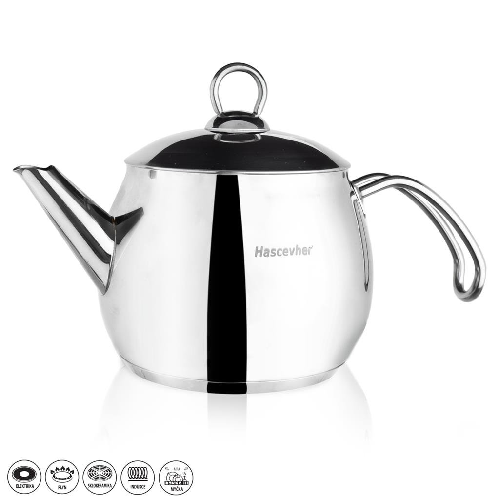 Čajník se skvěle uplatní jak v klasické, tak moderní kuchyni. Materiál: kvalitní nerezová ocel třídy 304. Rozměry: celkový objem 1,68 l, užitný objem 1,3 l, pr. 15 cm, v. 16 cm. Vhodný na všechny typy spotřebičů včetně indukce (celoplošné sendvičové dno) i do myčky na nádobí.