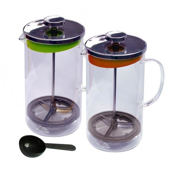 Konvice na kávu a čaj z borosilikátového skla s filtračním sítkem. Vhodná pro každodenní použití. Balení obsahuje dávkovač kávy/čaje. Konvice je vyrobena tak, aby usazenina z kávy či čaje zůstala po vyluhování na dně nádoby pod stlačovovací částí a přes síto se dal připravený nápoj čistý beze zbytků nalít rovnou do šálku.Lze mýt v myčce, kromě kovových částí konvice. Objem 1 l.