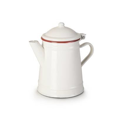 Bílá konvička s červeným okrajem a smaltovaným povrchem. číst celé