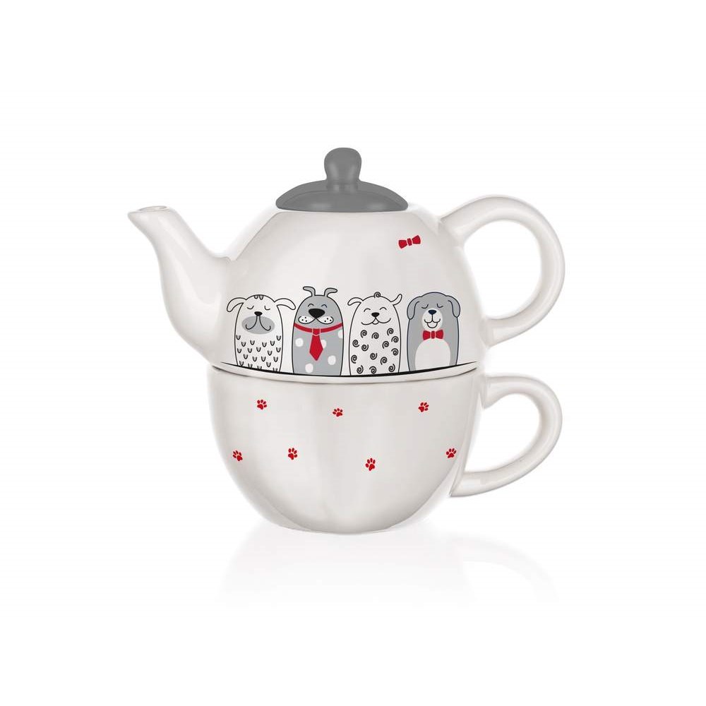 Konvička se šálkem DOGS jsou vyrobeny z keramiky v bílé glazuře s dekorem pejsků a šedým víčkem konvice. Objem konvice je 360 ml a objem šálku 330 ml. Konvici se šálkem je možné mýt v myčce na nádobí, ale pro zachování dokonalého vzhledu, doporučujeme umývat ručně.