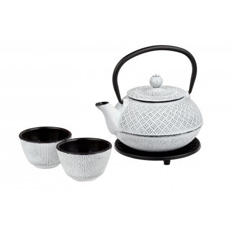 Litinová konvice o objemu 0,8 l s podložkou, dvěma miskami o objemu 0,12 l a nerezový m sítkem. Litinová konvice udržuje stálou teplotu, čaj si tak udrží svou svěží chuť i vůni po mnohem delší dobu.