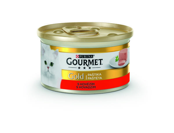 Kompletní krmivo pro kočky, které Vaší kočce každý den předvede nový zážitek a zároveň podporuje organismus. Vaše kočka je opravdový znalec a ráda zkouší nejrůznější textury a příchutě každý den. Proto GOURMET Gold vytvořil jemné paštiky, lahodné receptury, které potěší její mlsný jazýček novým chuťovým zážitkem během každého krmení. Kompletní krmivo pro dospělé kočky.Složení: Maso a vedlejší výrobky živočišného původu (z toho hovězí 4%), vedlejší výrobky rostlinného původu, minerální látky, cukry.Doplňkové látky: Nutriční doplňkové látky: m.j./kg: Vit A:1440; Vit D3:220; mg/kg: Fe(E1):10; I(E2): 0,2; Cu (E4):0,9; Mn(E5):1,9; Zn(E6):10. Technologické doplňkové látky: S konzervanty. Analytické složky: vlhkost 77,0 % protein 11,0 % obsah tuku 7,0 % obsah anorganických látek 3,0 % hrubá vláknina 0,1 %Dospělou kočku (4 kg) krmte 3 konzervami denně, nejméně ve dvou samostatných dávkách (porcích). Individuální potřeby se mohou lišit a krmnou dávku je proto nutné přizpůsobit tak, aby si Vaše kočka udržela optimální hmotnost. Březí a kojící kočky krmte podle jejich potřeby. Podávejte při pokojové teplotě. Čistá čerstvá voda by měla být vždy k dispozici.Tuto konzervu skladujte neotevřenou na suchém a chladném místě.